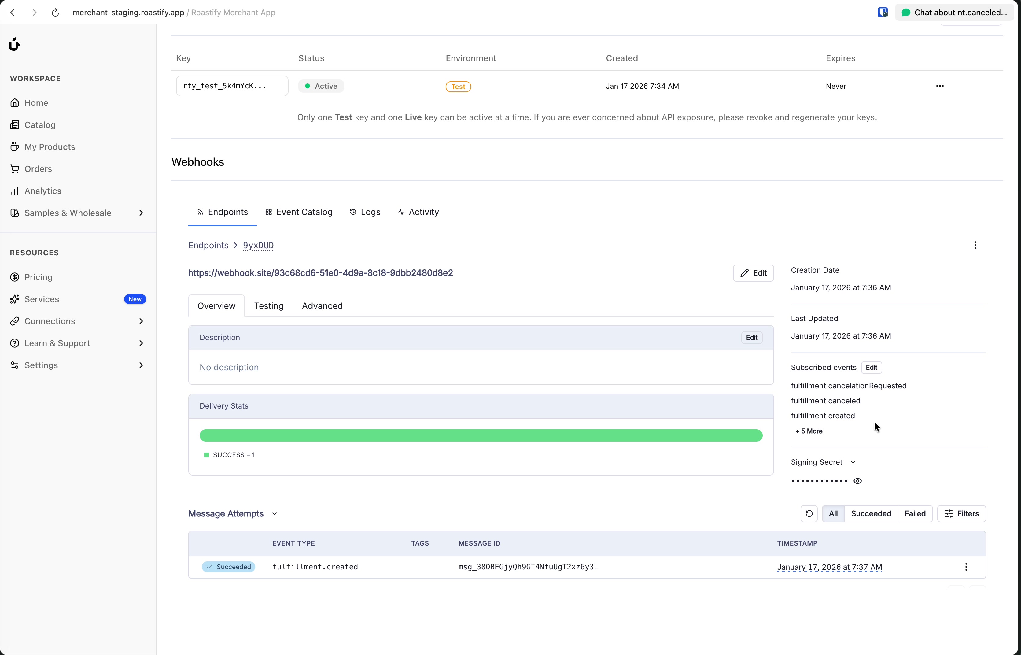 Each endpoint has a unique Signing Secret. Use this secret to verify that incoming webhooks are genuinely from Roastify.