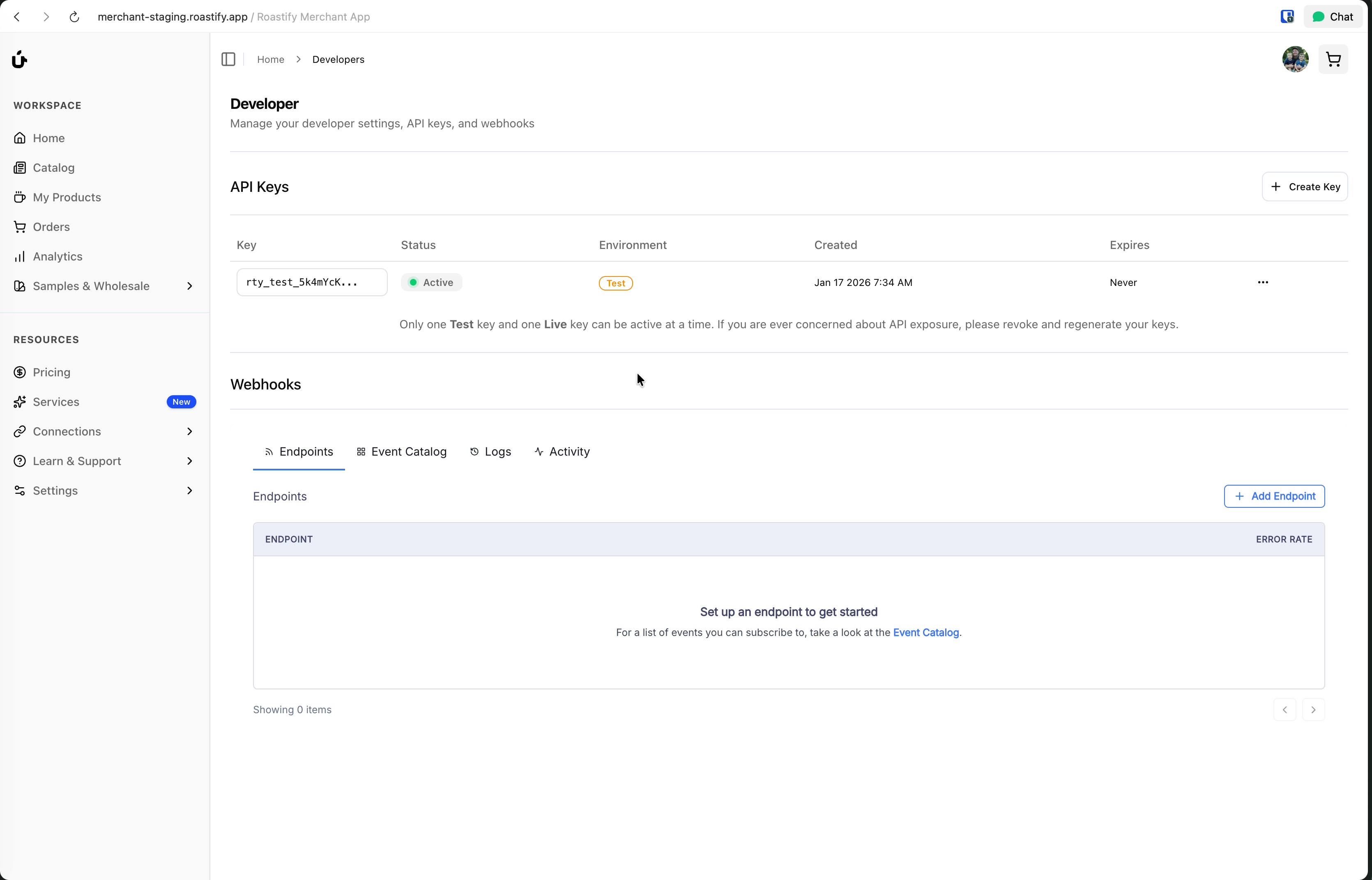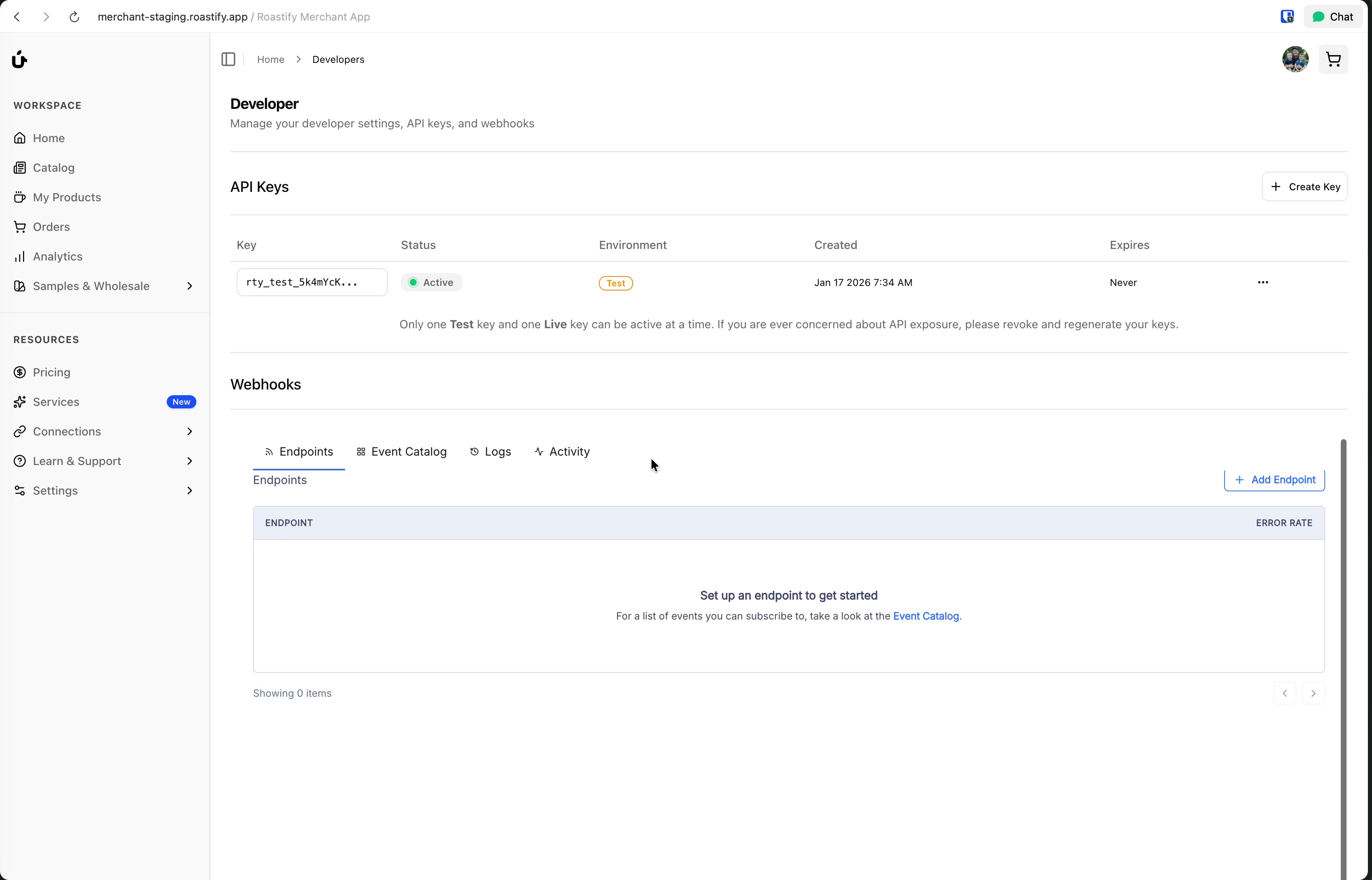 Once enabled, you'll have access to the webhook management portal where you can add endpoints, view logs, and test deliveries.