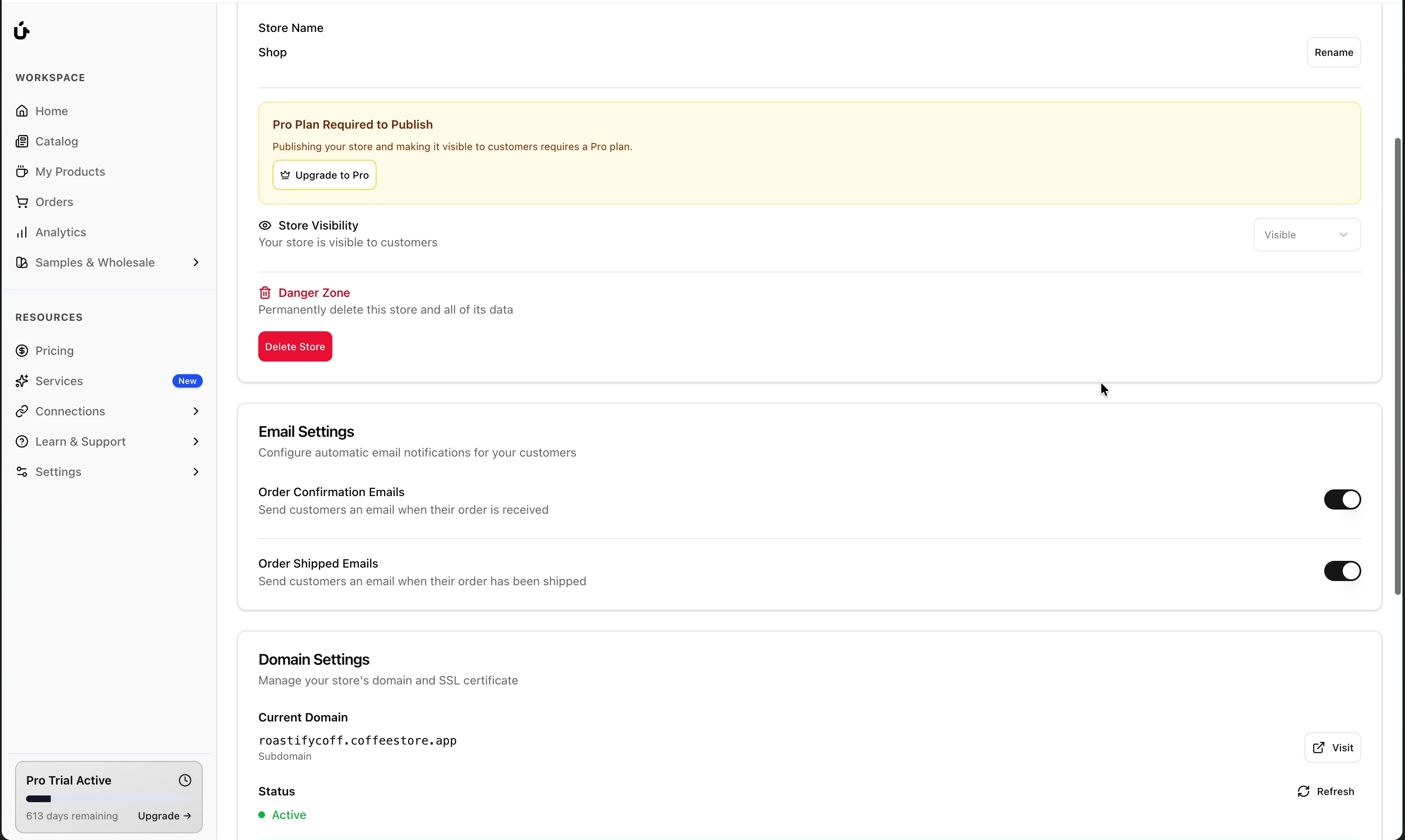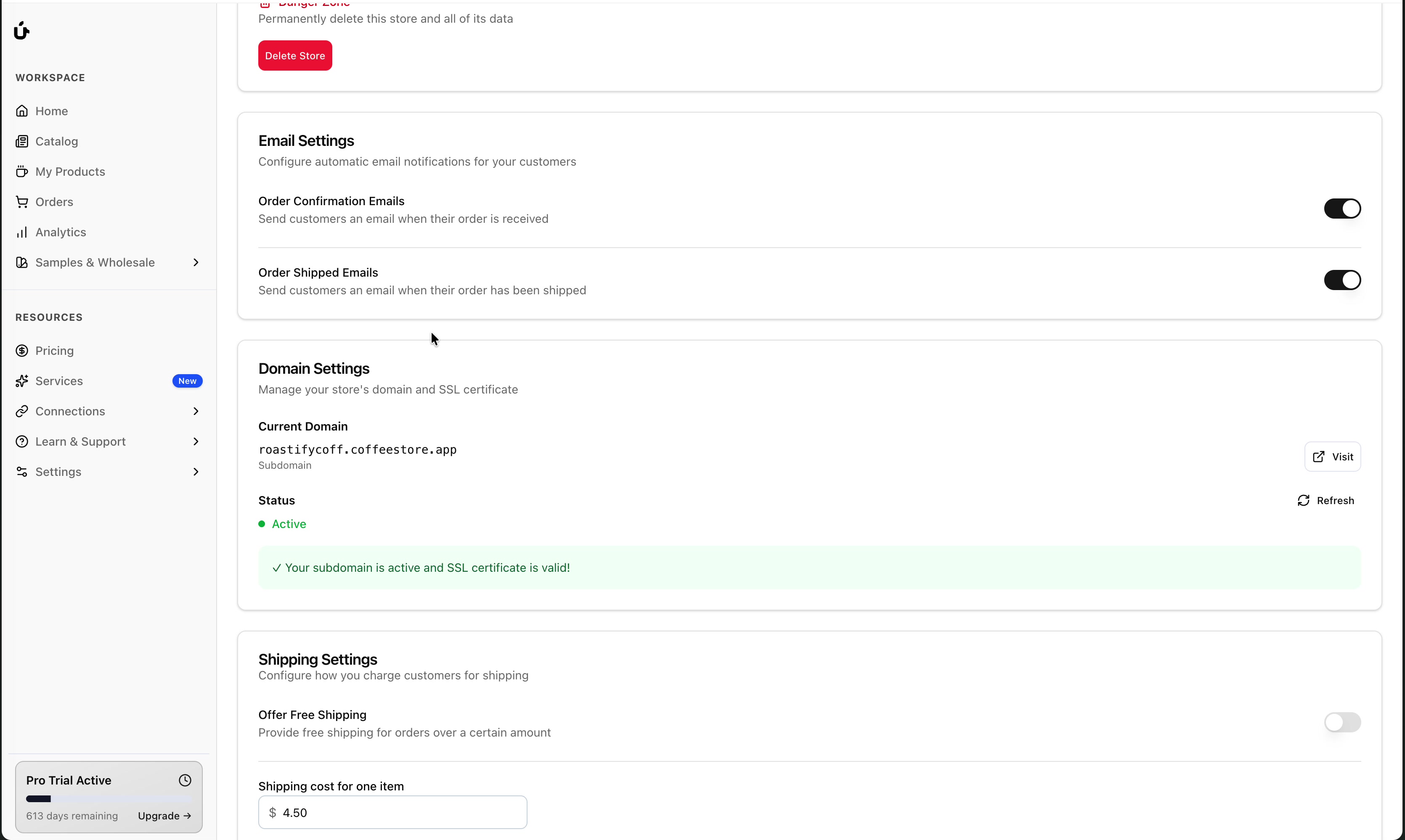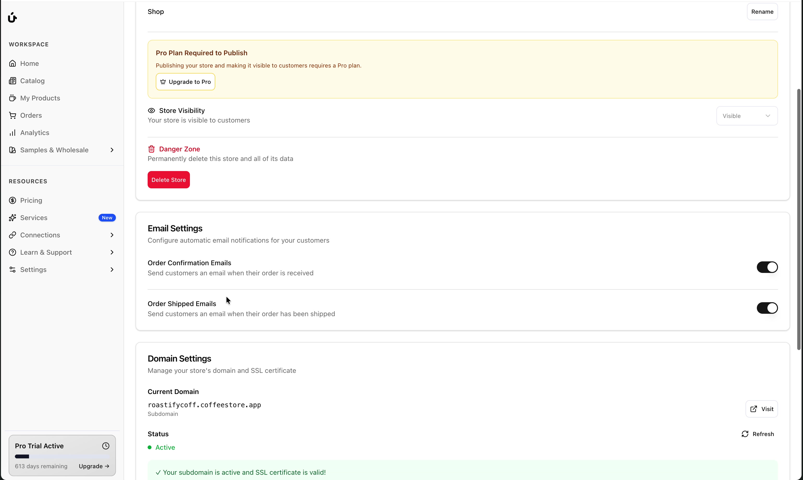 yourstorename.coffeestore.appThis subdomain is automatically configured and includes a valid SSL certificate for secure browsing.