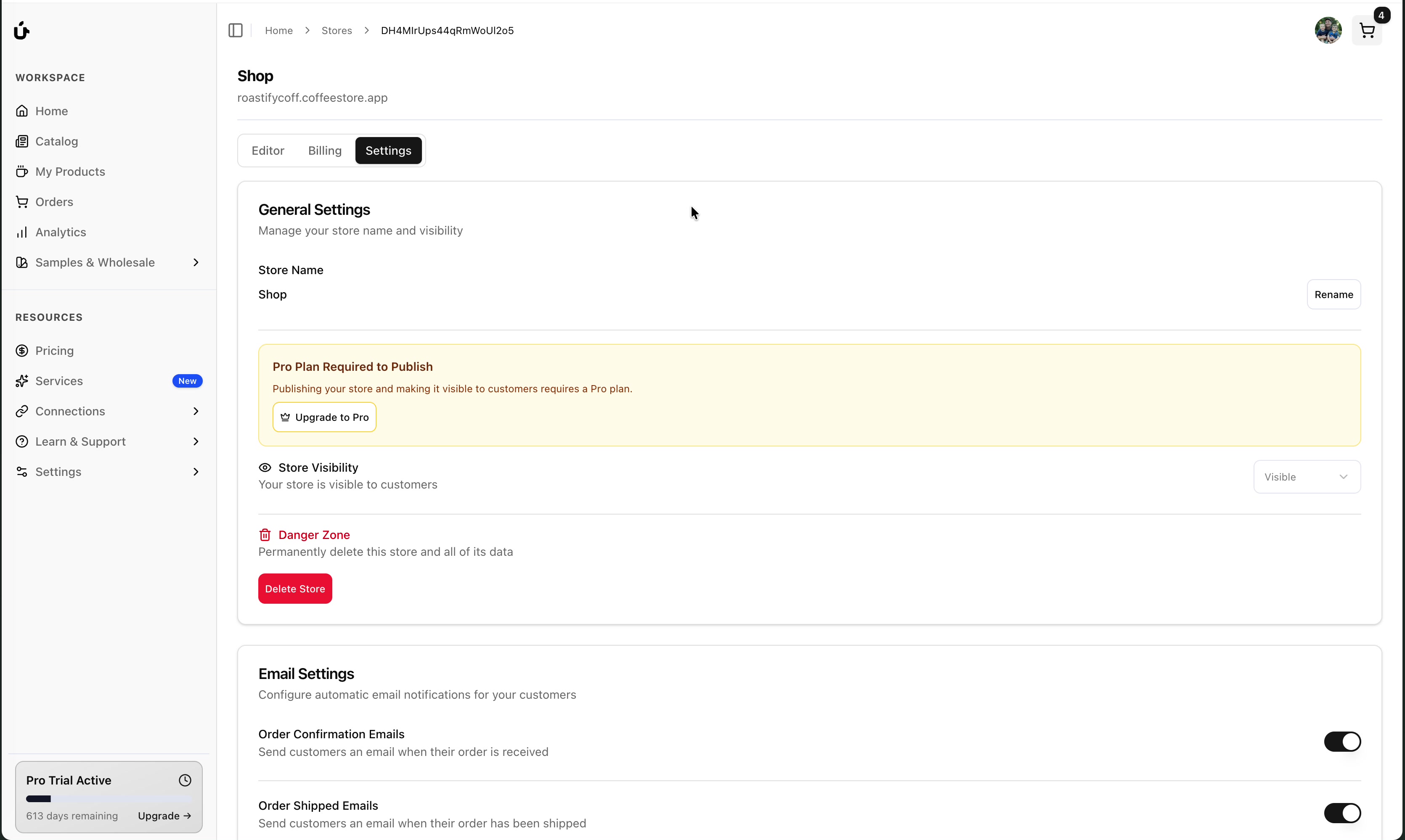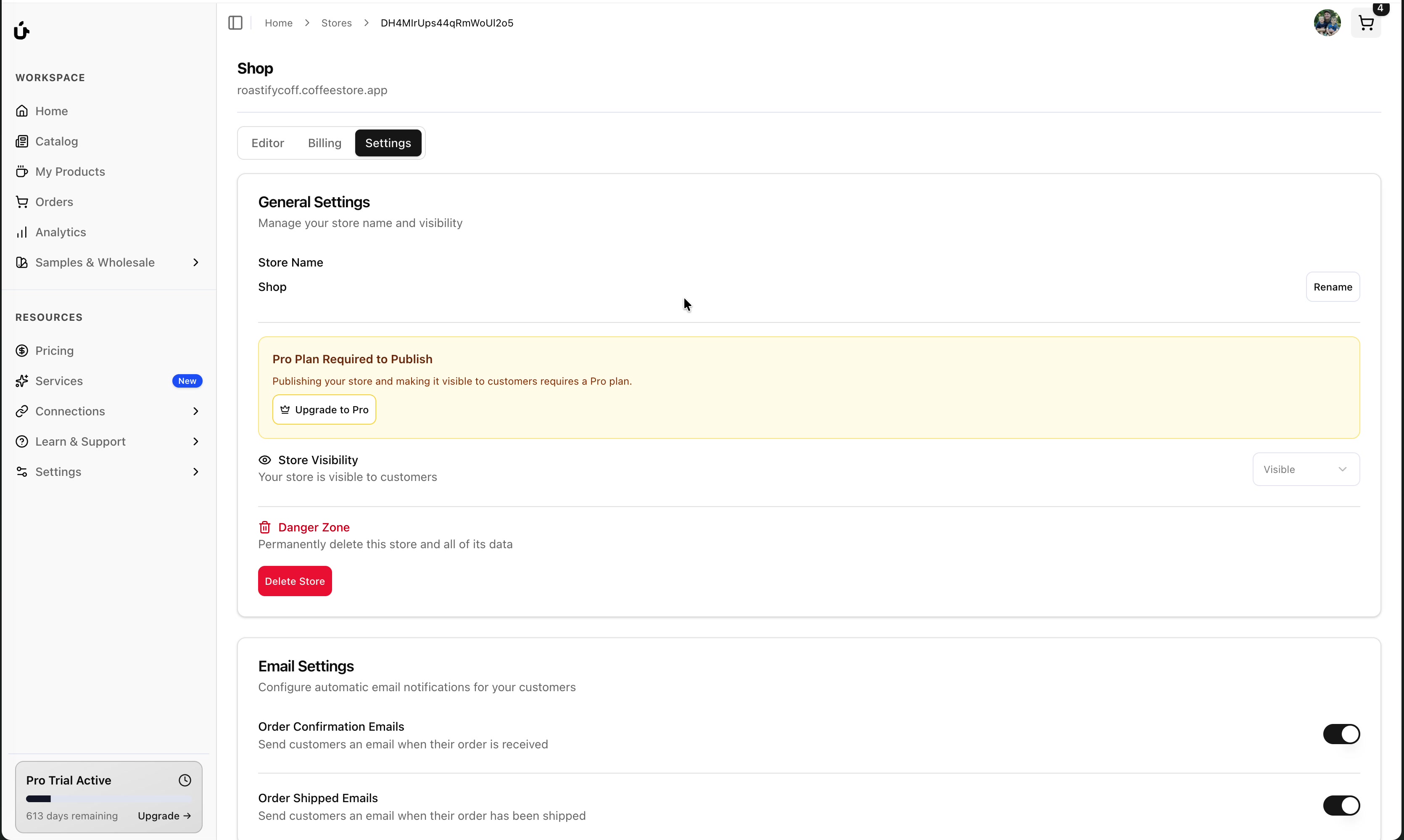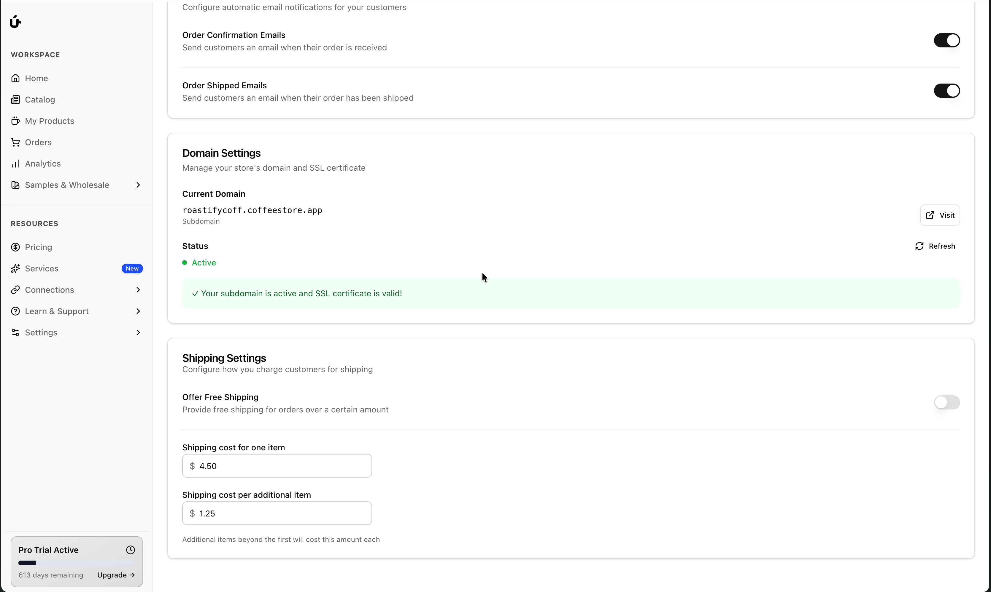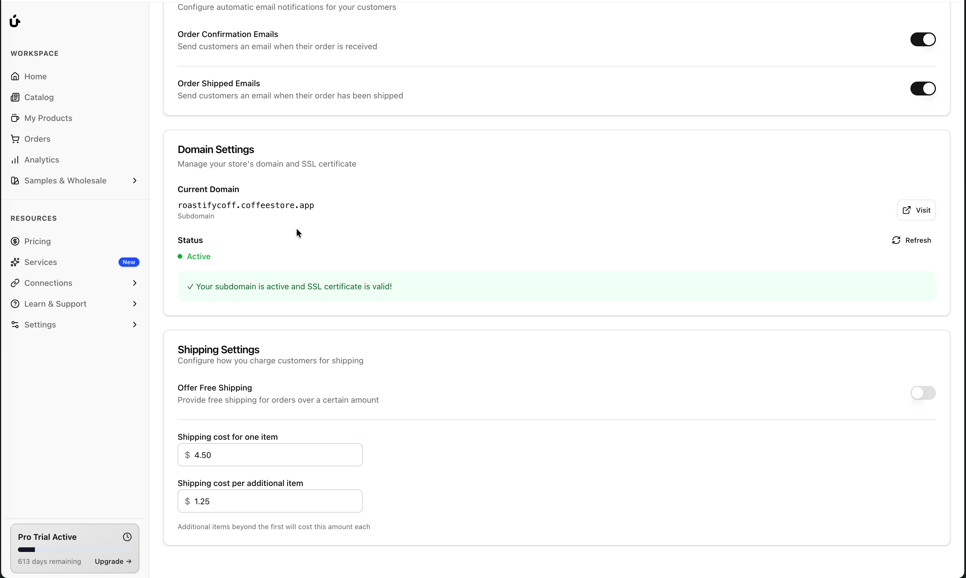 yourstorename.coffeestore.appThis subdomain is automatically configured and includes a valid SSL certificate for secure browsing.