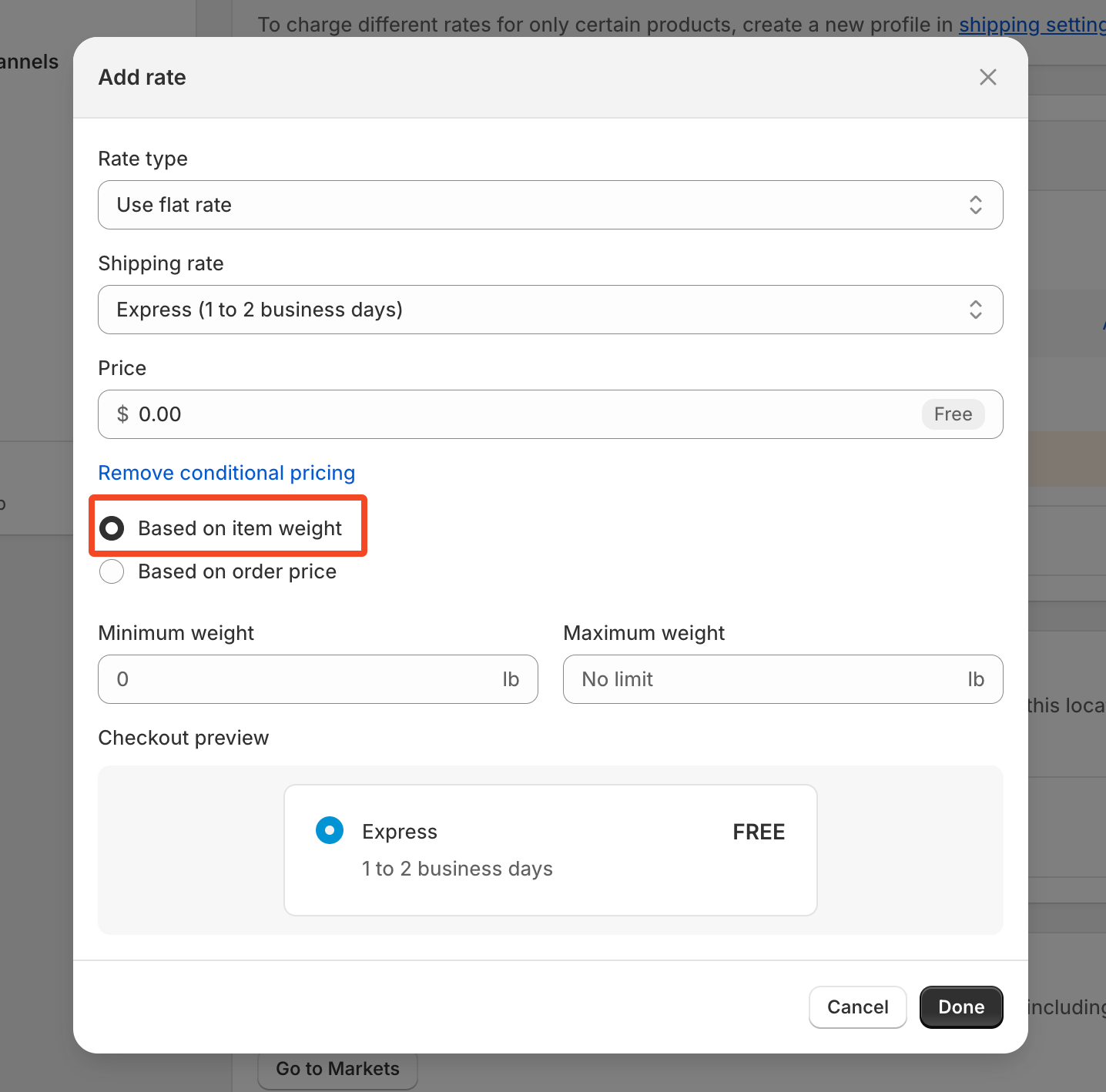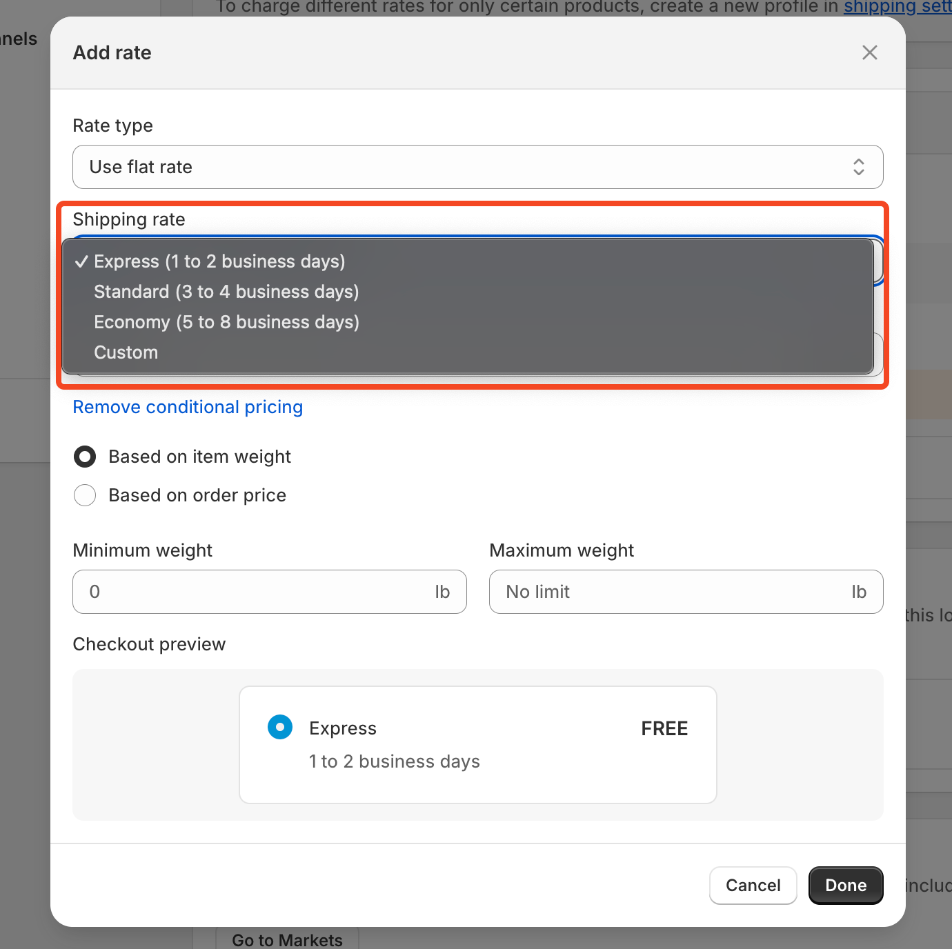 Conditional rates allow you to offer special shipping options based on order value or weight