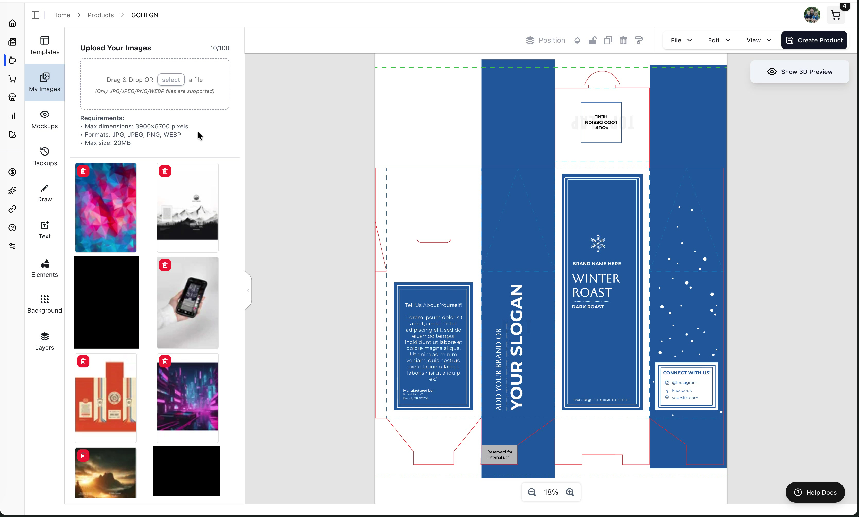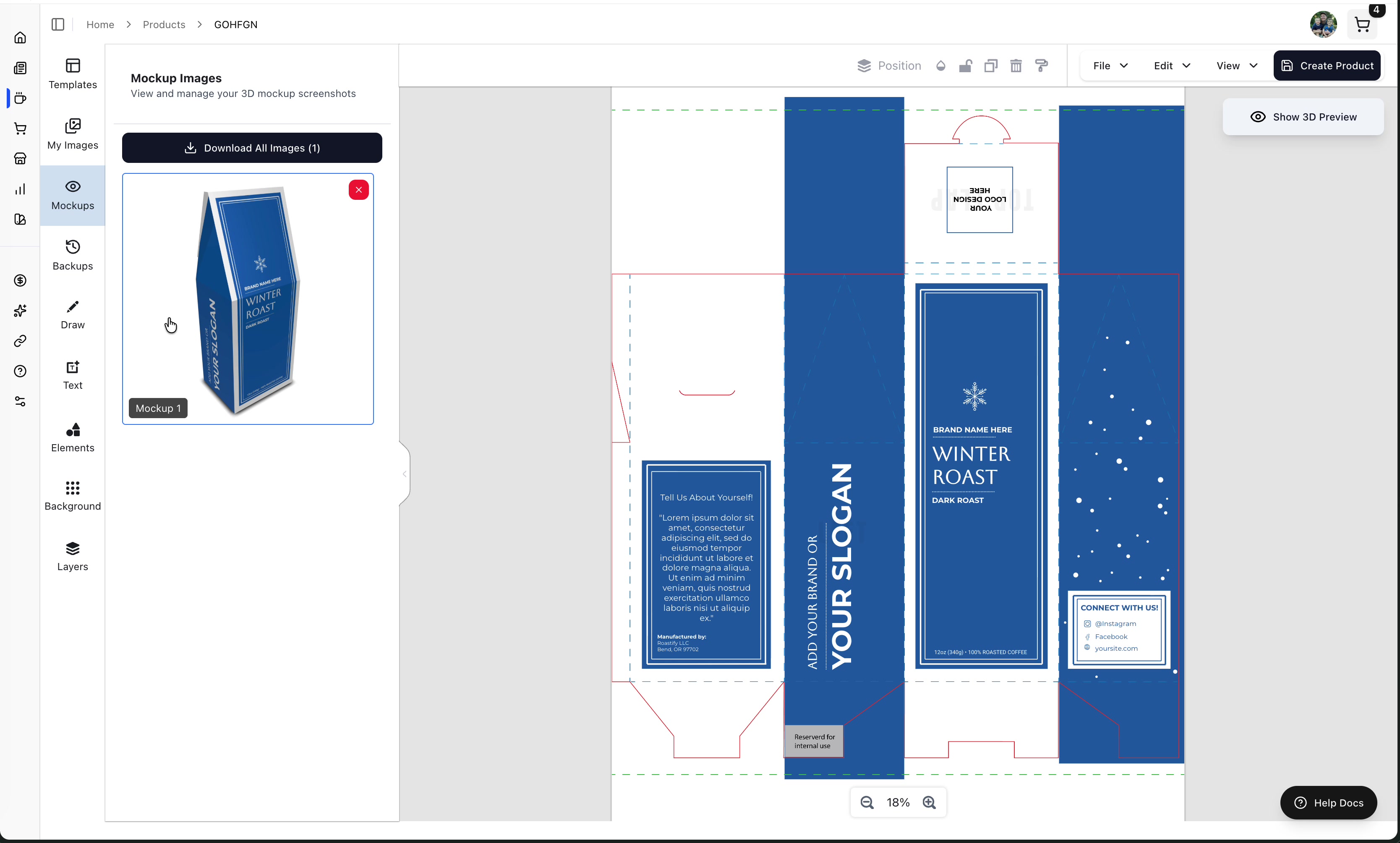 Recommended workflow: Design on the canvas, then periodically click "Show 3D Preview" to see how it looks in real life. Take mockups at different angles for marketing use.